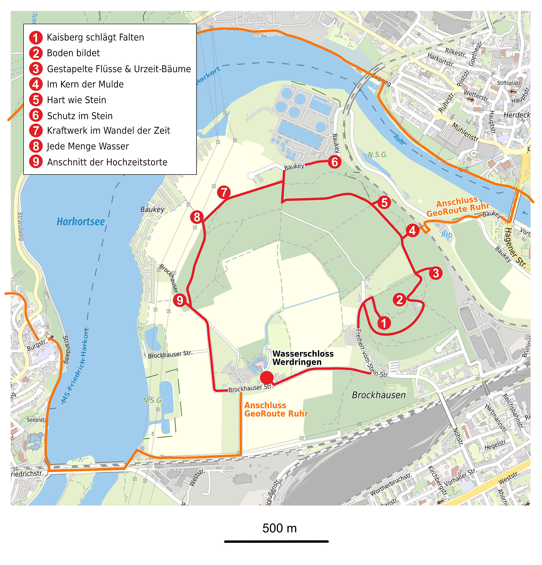 Der Rundgang auf dem Kaisberg bietet verschiedene Sehenswürdigkeiten: Landschaftseinblicke, Kulturdenkmäler, typische Gesteine aus der Region, ihre Entstehung und ihre Verwendung als natürlicher Rohstoff, Pflanzenfossilien sowie Erdgeschichte stehen auf dem Programm. Start- und Zielpunkt ist das Wasserschloss Werdringen mit dem Museum für Archäologie, wo auch Flyer mit einer Übersichtskarte ausliegen. Der Pfad wird vom GeoPark Ruhrgebiet und der Stadt Hagen. betreut. Jede Station ist mit einer Infotafel ausgestattet.