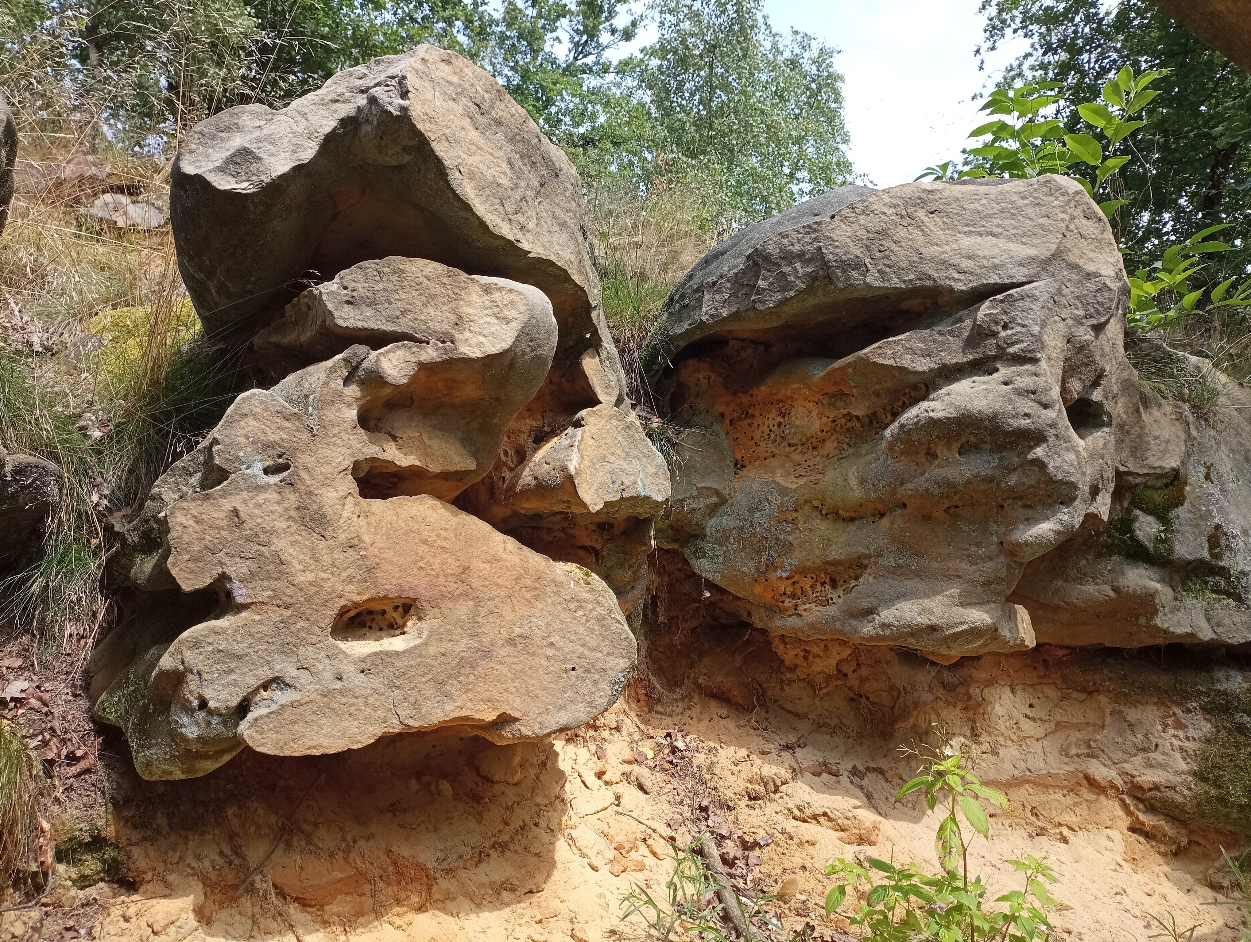 Der große Bruch südlich unterhalb der früheren Radarstation wurde erst 1933 für ein Straßenbauprojekt angelegt. Am Südrand des Plateaus verläuft ein schon 1835 beschriebener, 4-5 m tiefer Hohlweg von der Höhe an den Hangfuß. Das Gestein konnte hier über ein weniger steiles Gefälle abtransportiert werden. Ein ähnlicher Hohlweg befindet sich am Annaberg[3], wo ebenfalls Sandstein abgebaut wurde. Durch ungleichmäßige Verkieselung bildet das Gestein stellenweise skurrile Formen aus. Auf der Ostseite des Stimbergs hat ein freiliegendes Exemplar die Fantasie besonders beflügelt, der sogenannte „Teufelsstein“. Die „Becks’sche Kinderhand“, ein im Norden der Haard gefundenes, besonders ungewöhnlich geformtes Exemplar, sorgte Anfang des 19. Jahrhunderts für einiges Aufsehen.