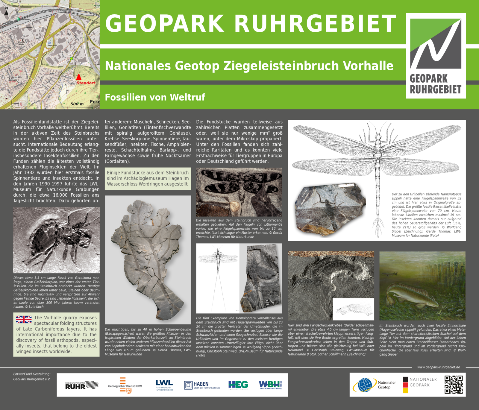 Weltberühmt ist die Fundstelle jedoch wegen der hier vorkommenden fossilen Insekten und Spinnentiere. Der Stammbaum der heute mit ca. 1 Million Arten zahlenmäßig weltweit größten Tierklasse der Insekten lässt sich 400 Millionen Jahre in die Vergangenheit zurückverfolgen. Die ersten Insekten waren flügellos. Fossilfunde dieser urtümlichsten Formen stammen zum Beispiel aus Schottland, Ost-Kanada oder den USA. Die Fossilfunde aus Hagen-Vorhalle zählen zu den ältesten bisher bekannten geflügelten Insekten.
